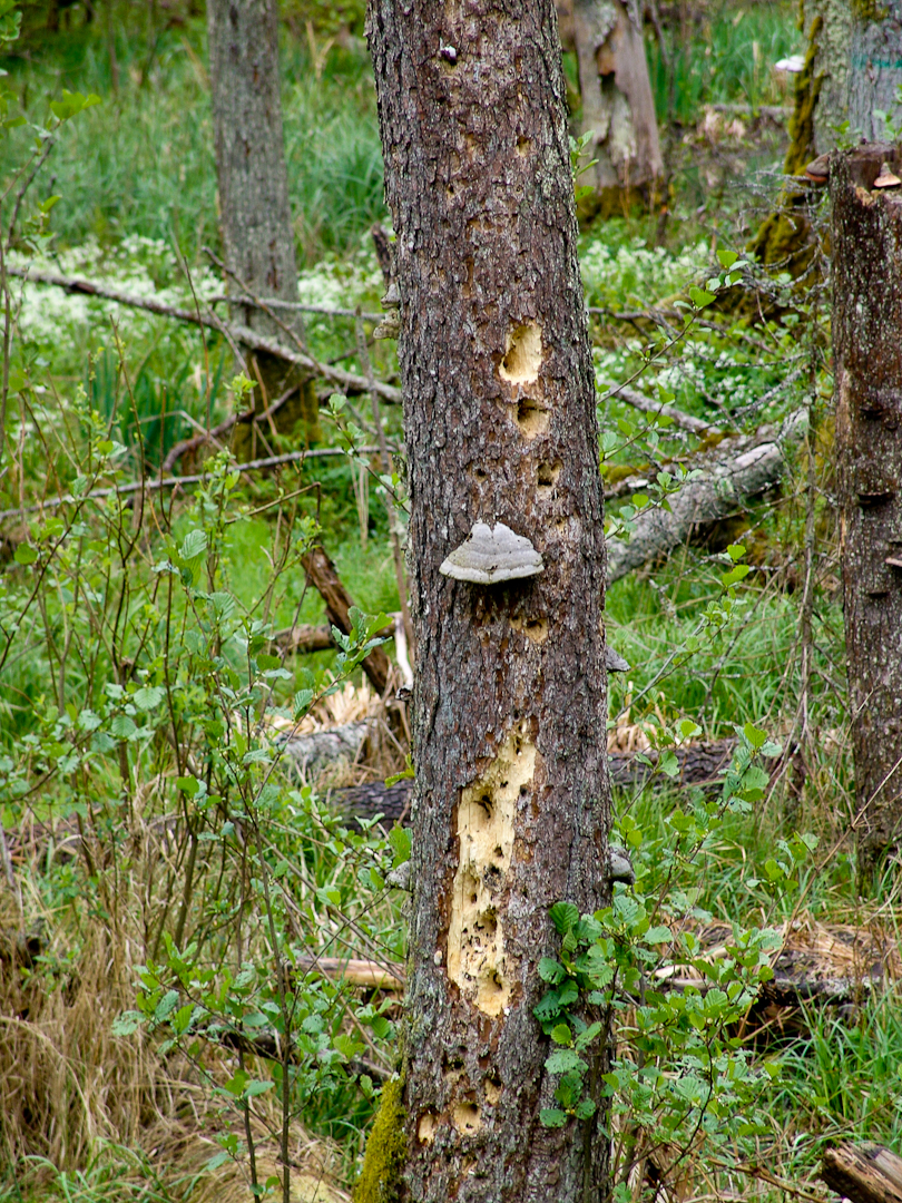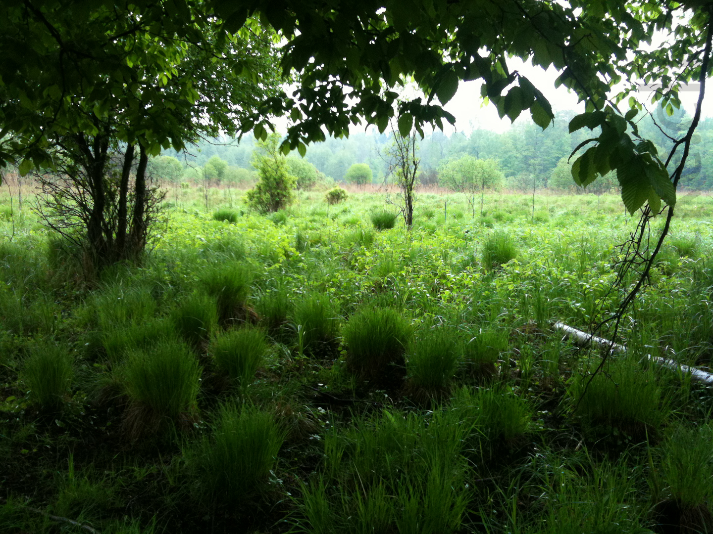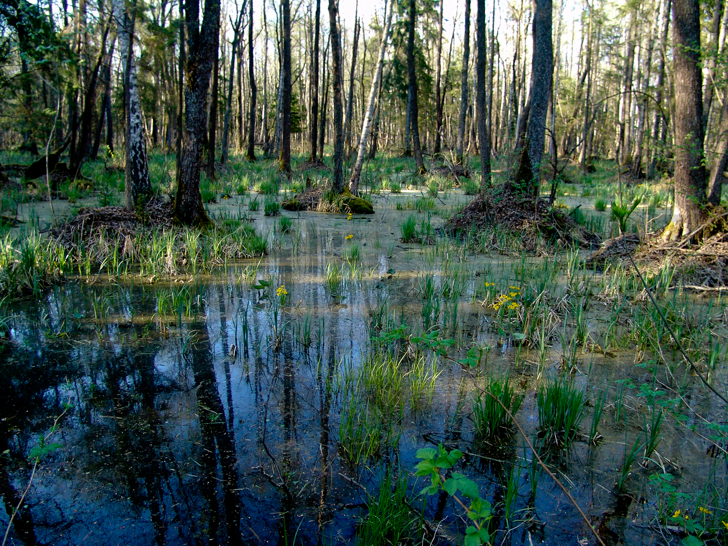 Der Biber hat hier ein Flüsschen gestaut und im Laufe der Zeit den Wald grossflächig unter Wasser gesetzt. Es starben die Bäume ab, was aber z. B. für Spechte und Insekten, wie auch seltene Pflanzenarten ein seltener und notwendiger Lebensraum darstellt.