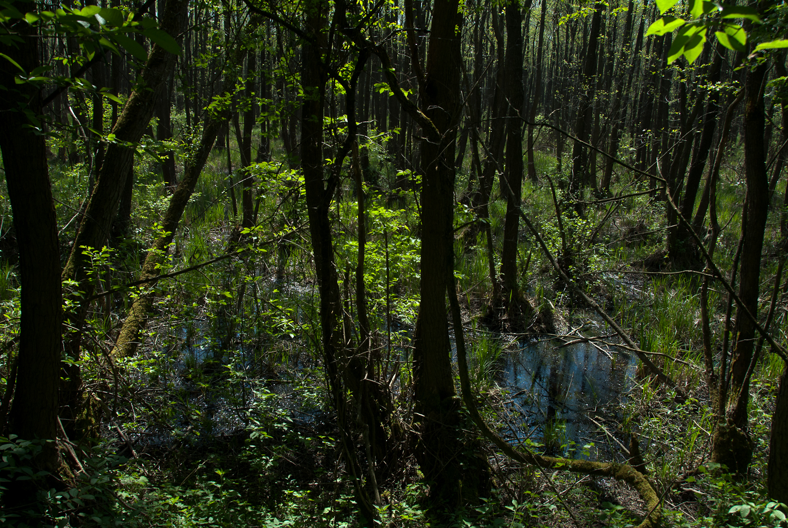 Nur Erlen können dauerhaft im Wasser stehen, ohne abzusterben. Farnwuchs und Spiegelungen auf der Wasseroberfläche - eine atemberaubend schöne Wildnis!