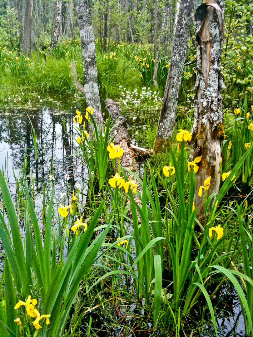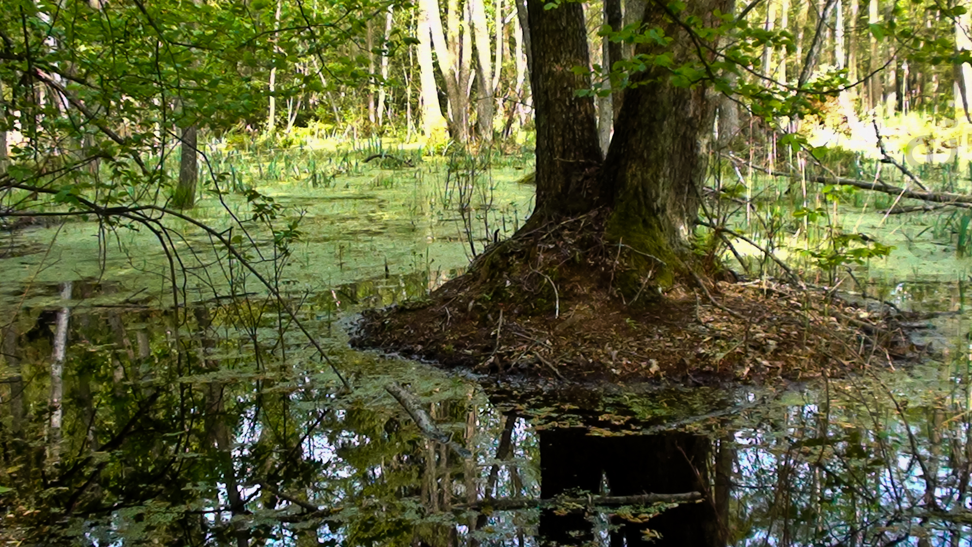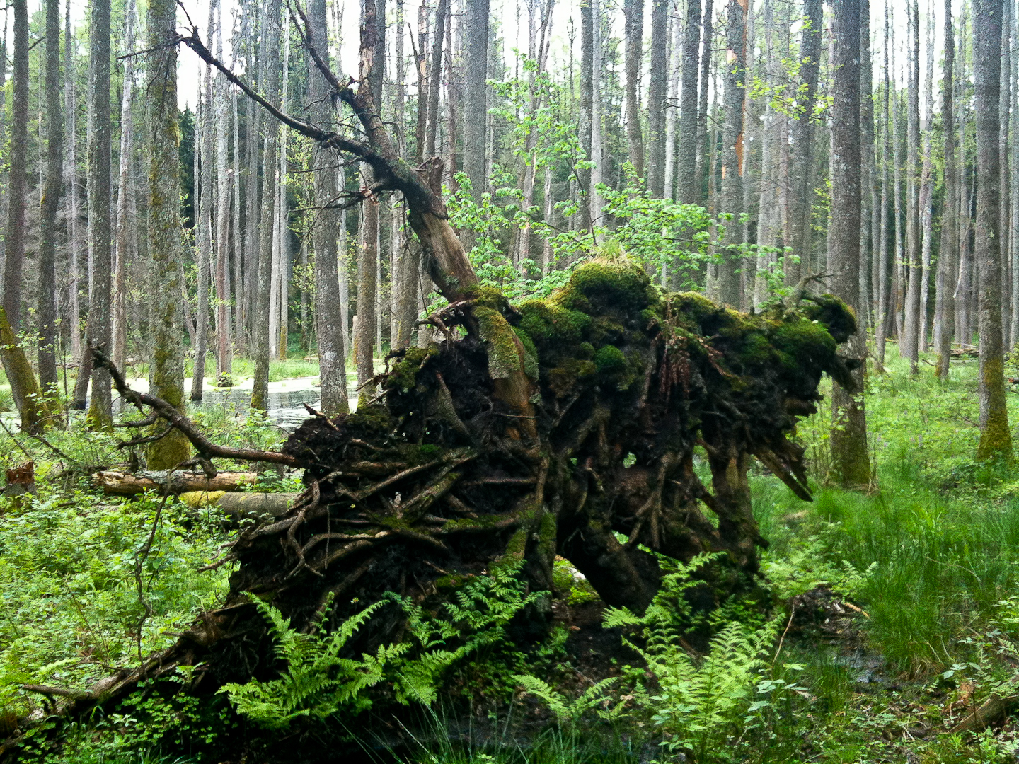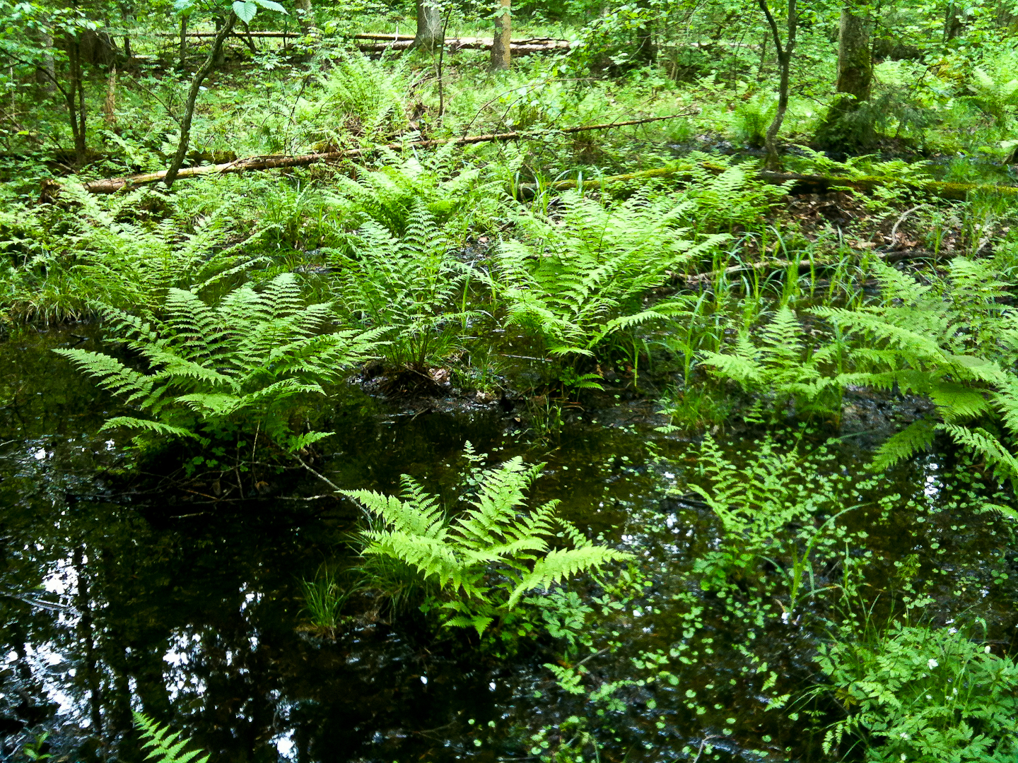 Nur Erlen können dauerhaft im Wasser stehen, ohne abzusterben. Farnwuchs und Spiegelungen auf der Wasseroberfläche - eine atemberaubend schöne Wildnis!