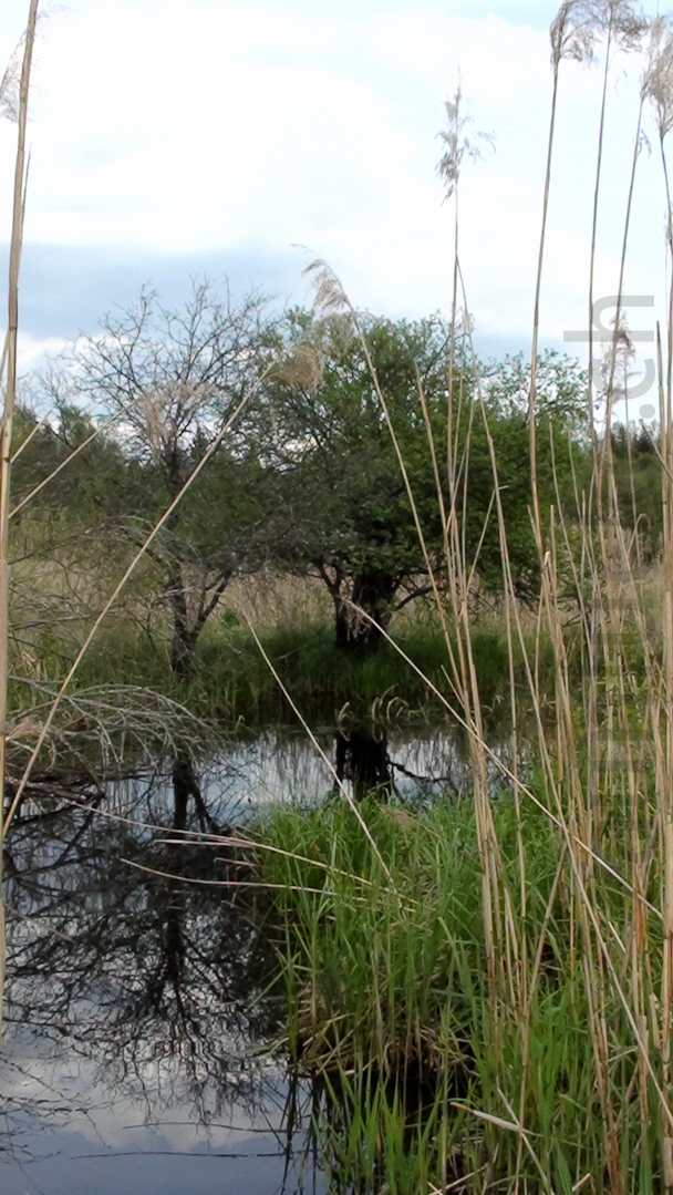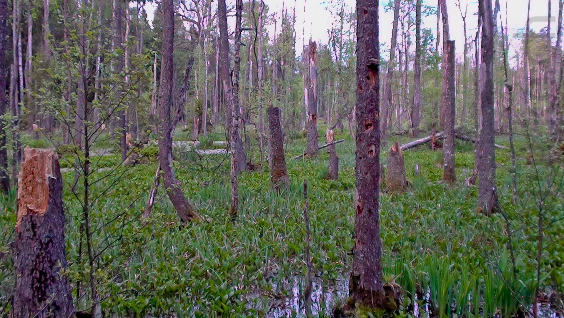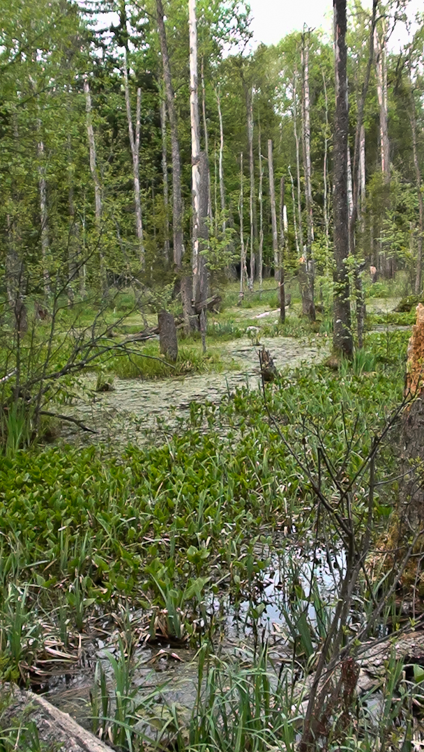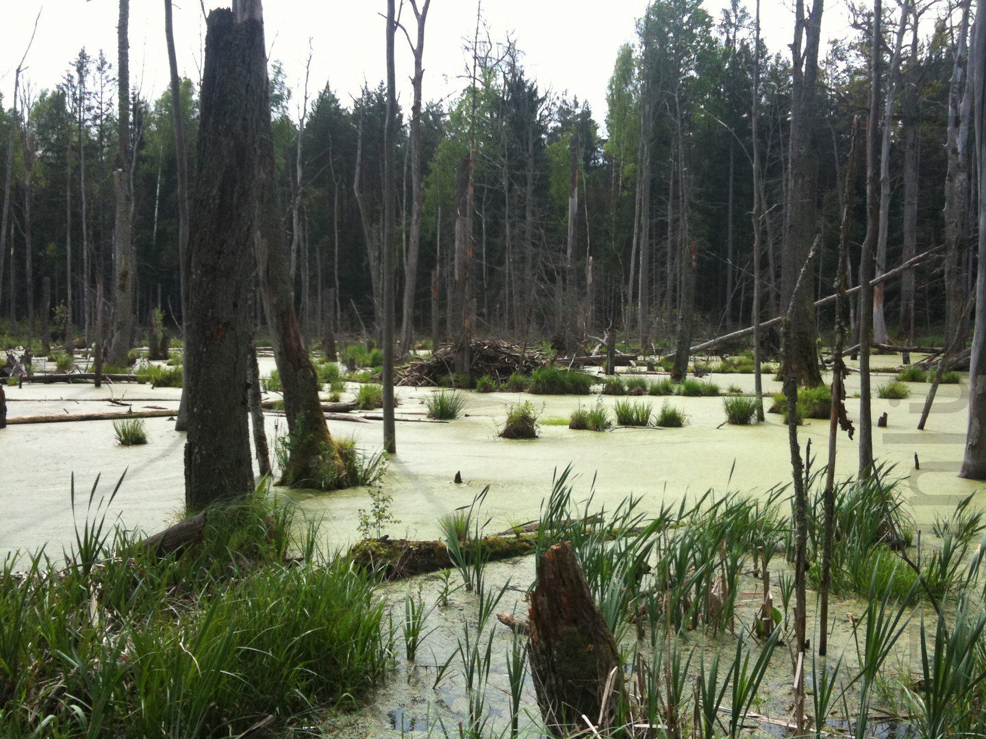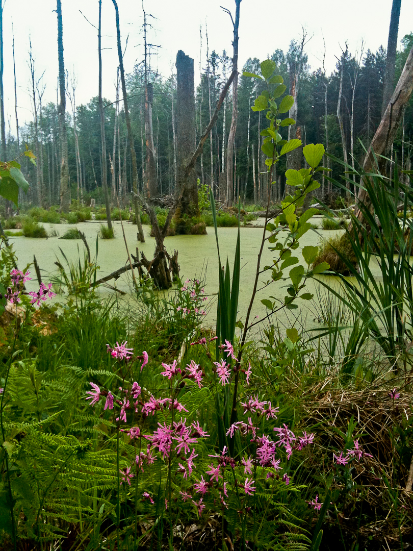 Der Biber hat hier ein Flüsschen gestaut und im Laufe der Zeit den Wald grossflächig unter Wasser gesetzt. Es starben die Bäume ab, was aber z. B. für Spechte und Insekten, wie auch seltene Pflanzenarten ein seltener und notwendiger Lebensraum darstellt.